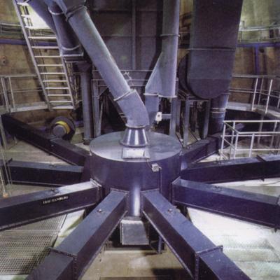 均化庫庫頂布料一般選用圓柱形生料分配器,該分配器充氣室用兩層滌綸纖維作充氣材料,以中壓離心鼓風機供氣。經流態化的生料由生料分配器通過斜槽多點均勻入庫。